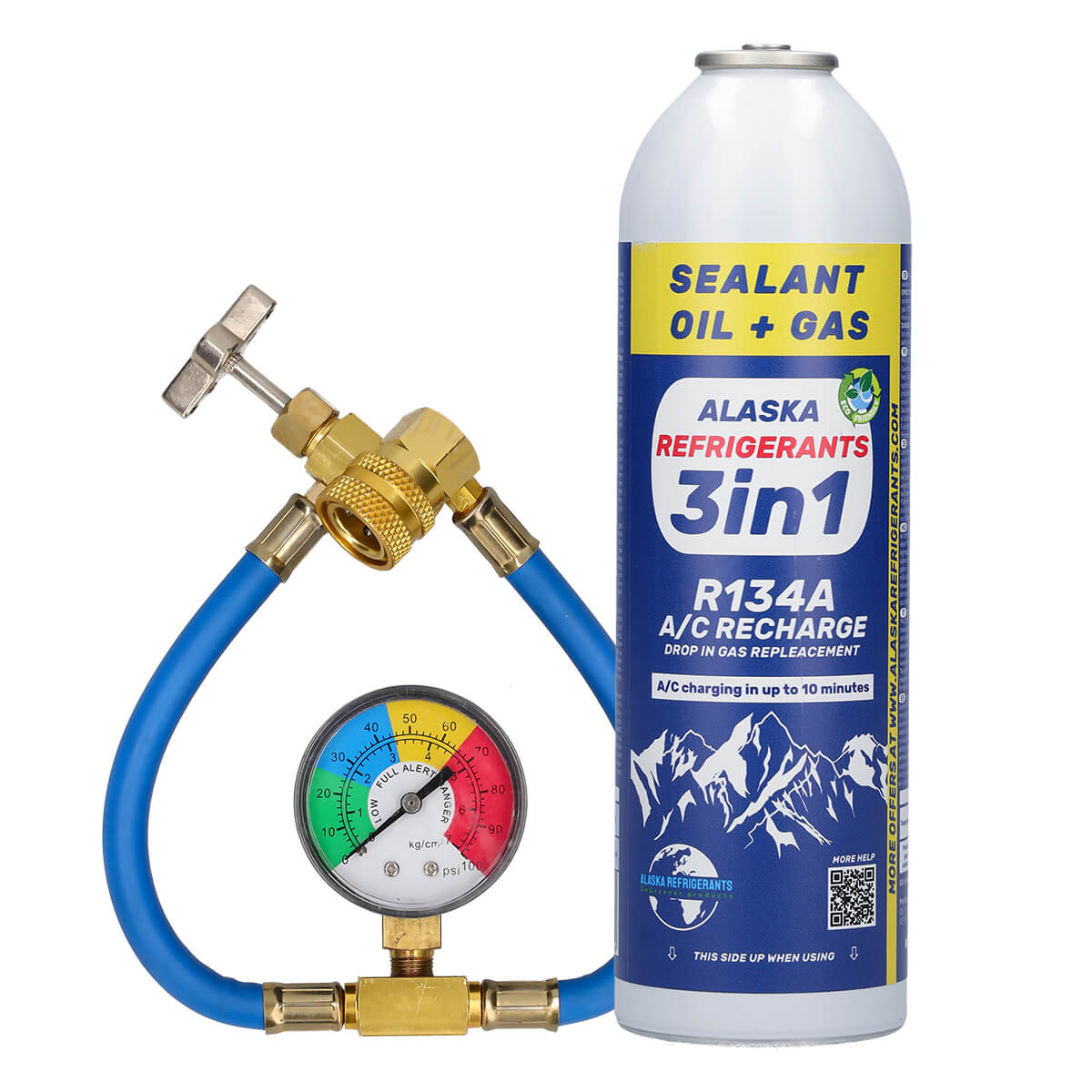 3v1 Alaska Refrigerants – náhradní chladivo do klimatizace R134a, olej PAG 100, těsnicí přísada + hadice a manometr